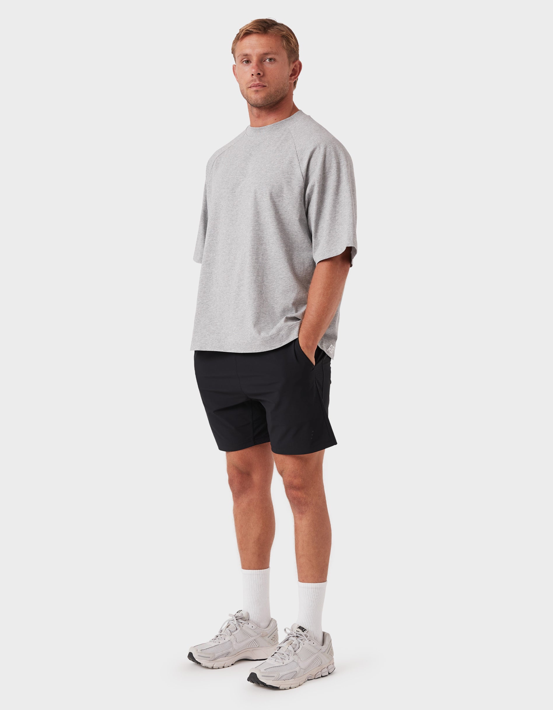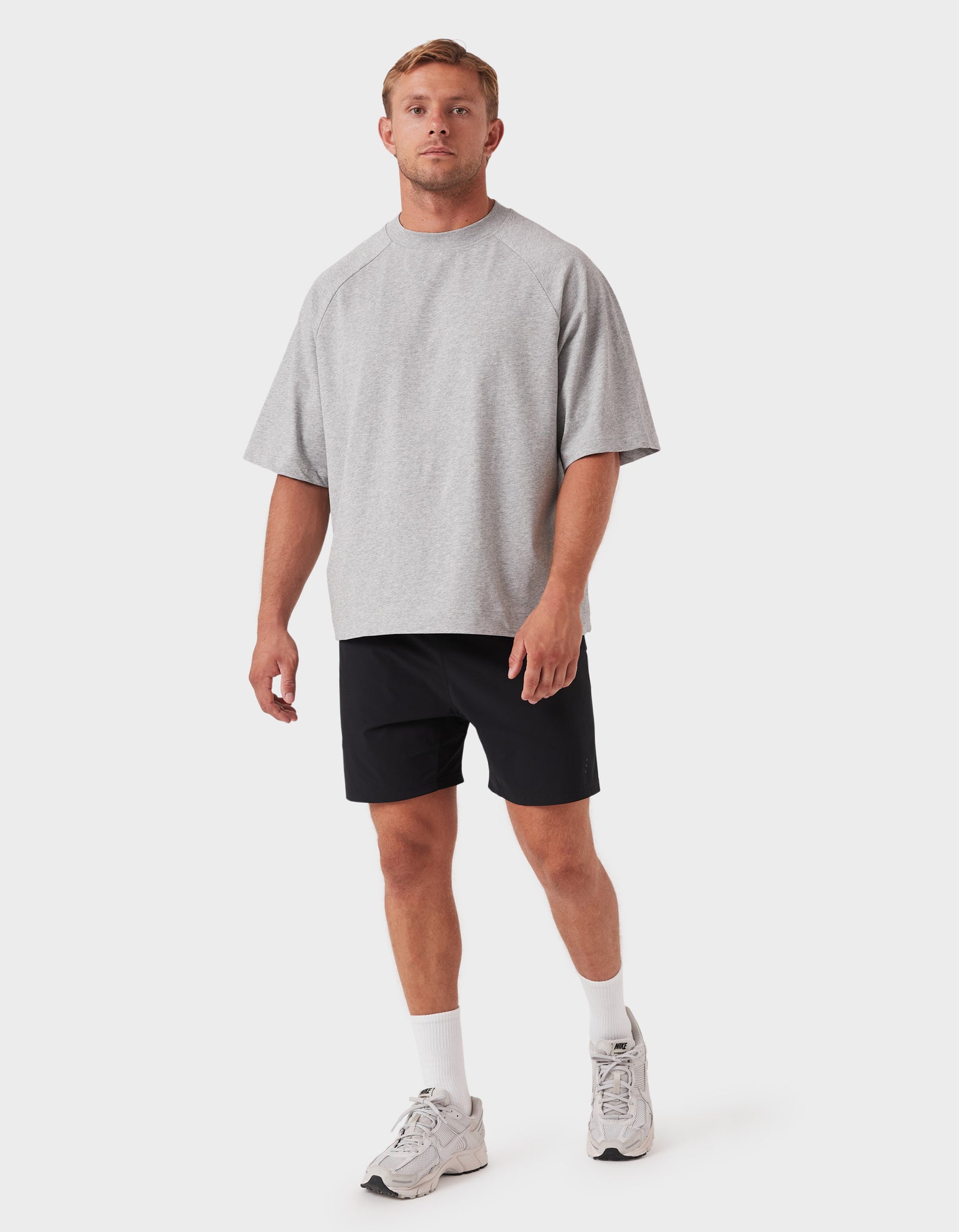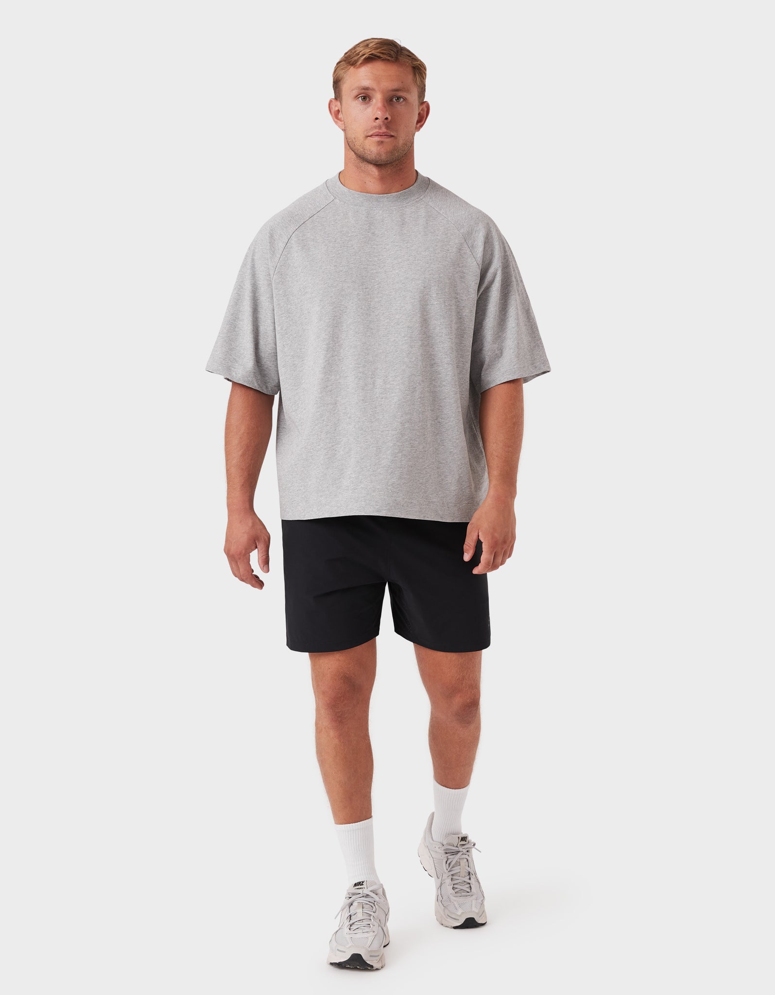 Notes: A premium blend of pure long-staple cotton and recycled cotton for a sustainable everyday essential. Oversized raglan tee with a slightly cropped, boxy fit and chunky neckline.